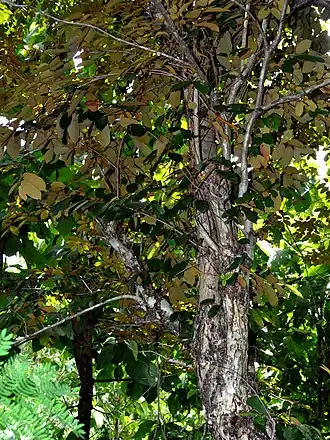 Die einfachen und kurz gestielten Laubblätter sind wechselständig. Der kurze Blattstiel ist bis 1 Zentimeter lang. Die Blätter sind verkehrt-eiförmig bis elliptisch, bespitzt oder spitz bis zugespitzt, seltener stumpf, ganzrandig und im vorderen Teil mehr oder weniger gezähnt. Die ledrigen Spreiten sind bis 17 Zentimeter lang, unterseits fein behaart und oberseits fast kahl. Die Nervatur ist dreizählig. Die kleinen Nebenblätter sind abfallend.