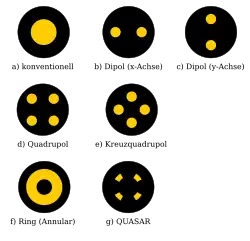 - Quadrupolbeleuchtung (engl. quadrupole illumination, quad), geeignet für Muster, bei denen alle Linien in x- oder y-Richtung orientiert sind, aber nicht für schräge Linien (z. B. 45°)