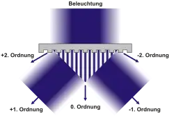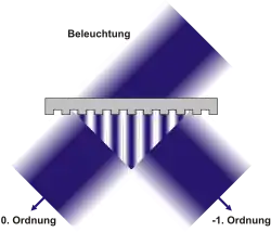 Üblicherweise erfolgt die Beleuchtung senkrecht zur Maske, das heißt parallel zur Achse des optischen Systems, oft als köhlersche Beleuchtung (nach August Köhler) bezeichnet. Dabei breitet sich die 0. Beugungsordnung in Richtung der Einfallsrichtung weiter im optischen System aus, während die anderen Ordnungen seitlich gebeugt werden. Da der Ablenkungswinkel für höhere Ordnungen mit kleiner werdenden Strukturgrößen zunimmt, gelangt bei sehr kleinen Strukturen nur die 0. Ordnung durch die Maske zur Objektivlinse und somit zur Fotolackschicht. Allerdings enthält die 0. Beugungsordnung nur Informationen über die Lichtquelle, was dazu führt, dass die Struktur der Fotolackmaske nicht in der Fotolackschicht abgebildet wird. Für eine erfolgreiche Abbildung sind daher mindestens eine weitere Beugungsordnung notwendig und allgemein nimmt die Abbildungsqualität mit der Anzahl der Beugungsordnungen zu, wobei der Einfluss auf die Qualität bei höheren Beugungsordnungen schnell geringer wird.[3] Um ein möglichst hohes Auflösungsvermögen und dennoch eine ausreichend hohe Abbildungsqualität zu erzielen, ist es ausreichend, dass die 0., +1. und −1. Beugungsordnung die Objektivlinse erreichen (3-Strahl-Beleuchtung).