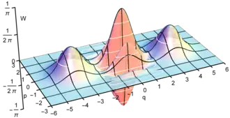 bezeichnet, wobei ein Normierungsfaktor ist. Die Bezeichnung Katzenzustand ergibt sich daraus, dass α und damit die Schwingungsweite prinzipiell beliebig große Werte annehmen kann, und die beiden gegeneinander schwingenden Anteile somit zuweilen räumlich makroskopisch unterscheidbar werden, wie die tote und die lebendige Katze. Die Abbildung zeigt die Wignerfunktion des Katzenzustands mit den beiden Wellenpaketen zu und sowie einem zentralen Maximum, das vom Interferenzterm herrührt.