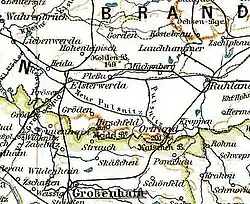 Die historische Flur Schraden wurde ursprünglich im Westen von den Feldmarken Elsterwerda und Krauschütz und im Osten von der Grenzpulsnitz begrenzt. Im Norden grenzte sie an die Feldmarken der Dörfer Plessa und Kahla, im Süden an die Feldmarken der nördlich der Gröden-Hirschfelder Endmoräne gelegenen Schradendörfer Merzdorf, Gröden, Hirschfeld sowie weiter östlich an Großthiemig, Frauwalde und Großkmehlen. Nachdem 1727 der kursächsische König August der Starke und somit der sächsische Staat in den Besitz der Herrschaft Elsterwerda kam, zählten auch einige Flächen nördlich der Schwarzen Elster zum Schraden.[1]