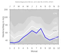 Monatliche Durchschnittsniederschlagshöhen für Elsterwerda von 1951 bis 1980[5]