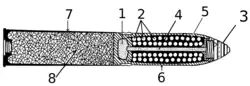 Schrapnelle sind eiserne Hohlgeschosse, die mit 13 bis 17 g schweren Bleikugeln gefüllt sind. Diese sind, um bei der Rotation des Geschosses während des Flugs ihre Lage nicht zu verändern, durch Eingießen von Schwefel oder Kolophonium fixiert. Auf diese Weise sollen Störungen in der Regelmäßigkeit der Flugbahn vermieden werden. Es gab auch Schrapnellgranaten mit Mischladung, bei denen die Kugeln in den Sprengstoff eingebettet waren (Einheitsgeschoss). Bei diesen Einheitsgeschossen wurde der Sprengstoff jedoch in Schrapnellstellung nicht gezündet und verbrannte lediglich.
