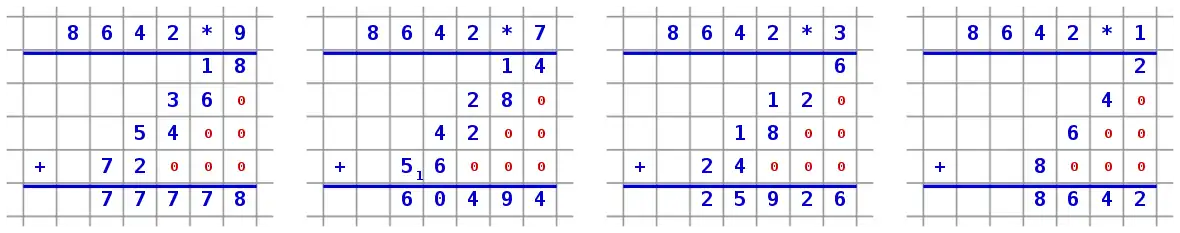 - Wenn die Teilmultiplikation in Schritt 2 zu kompliziert erscheint, kann dafür die schriftliche Multiplikation erneut ausgeführt werden, indem die andere Zahl in Ziffern zerlegt wird. Die Schritte dieser Teilmultiplikationen sind dann so einfach, dass sie in einer Tabelle des kleinen Einmaleins nachgeschaut werden können.