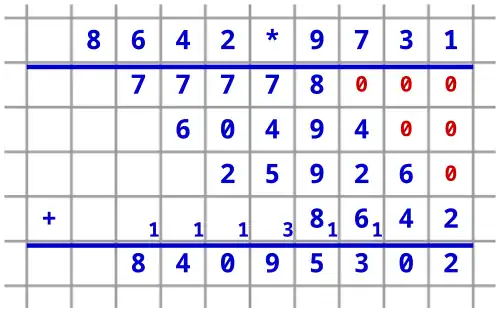 - Das Endergebnis ist das Produkt der beiden Eingaben, in derselben Ziffernschreibweise wie die Eingaben.