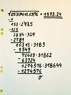 Die oben ermittelte Zahl wird also durch dividiert, das Ergebnis ist , der Rest darf allerdings nicht kleiner als sein. Nach Subtraktion von und wird die nächste Zweiergruppe des Radikanden hinzugezogen und der nächste Rechenschritt in gleicher Weise ausgeführt. Beendet ist das Verfahren entweder, wenn der Radikand durch die wiederholten Subtraktionen auf Null reduziert werden konnte (dann ist der Radikand eine Quadratzahl) oder das Ergebnis eine ausreichende Genauigkeit aufweist (als Nachkommastellen des Radikanden können beliebig viele Nullen angehängt werden).