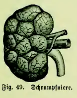 Die Schrumpfniere oder Nephrozirrhose[1] (Nierencirrhose[2]) ist der Endzustand vieler Nierenparenchymerkrankungen. Die Umwandlung von Nephronen in Binde- bzw. Narbengewebe ist in der Regel mit dem fast vollständigen Funktionsverlust des Organs verbunden. Geschieht dies einseitig, kann die andere Niere durch Hypertrophie die Funktion des ausgefallenen Organs mitübernehmen. Bei beidseitiger Schrumpfniere besteht eine Niereninsuffizienz.[3]
