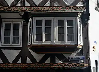 Das Haus hat drei jeweils über die untere Ebene auskragende Geschosse, deren Fachwerkschwellen eine Spätform des Laubstabes zeigen. Unter den Fenstern sind teilweise farbige Taubänder als Verzierung angebracht. Im 1. Stock rechts befindet sich ein kleiner, zweifenstriger Erker, der wohl erst im 18. Jahrhundert hinzugefügt wurde, um von dort auf den Marktplatz blicken zu können.[3]
