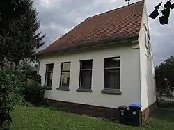 In einem 90-Grad-Winkel vom Schiff nach Westen befindet sich der Schulraum. In der Südwand links vom Betsaal befindet sich der Zugang zum Gebäude. Das Portal wird über eine kleine dreistufige steinerne Freitreppe erreicht. Die Eingangstür liegt etwas zurückgesetzt unter der Traufe des Teilbaus. Die Überdachung wird von zwei schlichten Pilastern getragen. Die westliche Giebelwand verfügt über zwei Rechteckfenster im Dachgeschoss. Diese sind umrandet und haben eine profilierte Überdachung. Die Fenster des Schulraums sind in der nördlichen Außenwand. Es handelt sich um schmucklose Rechteckfenster.
