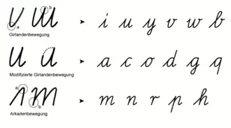 Die statisch aufgebauten Minuskeln der alten Schriftvorlage hatten breite Bogen und lange Deckstriche. Damit wurden Bewegungsmuster eingeübt, die der Entwicklung einer rhythmischen und damit ergonomischen Schreibbewegung entgegenstanden.[9] Das führte im Verlauf der Automatisierung und Individualisierung der Bewegungen häufig zu Verformungen, die sich in ihrem infantilen Charakter teilweise bis in Erwachsenenschriften erhielten.