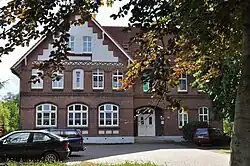 Das zweigeschossige historisierende zurückgesetzte Gebäude auf Sockel in Backstein mit ziegelgedecktem Satteldach und quer zur Firstlinie stehendem Südtrakt wurde 1887 gebaut. Die Giebelfelder nach Norden, Osten und Westen sind mit Quadern ausgearbeitet. Die horizontale Gliederung erfolgt durch Friese wie Deutsches Band, Zahnschnitt- oder Würfelfries. Die Ortgänge sind großformatig abgetreppt. Die Fensteröffnungen und das straßenseitige Eingangsportal haben Segmentbögen.[2]