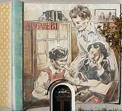 An dem östlichen Giebel befindet sich seit 1987 das Wandbild „Frère Jacques, dormez-vous?“ von Jub Mönster mit einem Motiv des Schullebens.