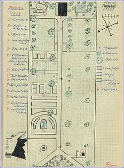 - Laube (vorhanden, bis dahin nur als Gerätehaus genutzt, Reparatur und Verschönerung Sommer 1954)