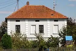 Der zweigeschossige, verputzte Walmdachbau mit Mezzaningeschoss und rustizierten Lisenen besitzt vier zu drei Fensterachsen.