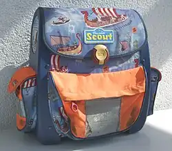 Der auf dem Rücken getragene Schulranzen hat sich historisch aus dem Rucksack (Tornister), dem Kalbfell- und Segeltuchtornister des Soldaten, entwickelt. Erst gegen Ende des 19. Jahrhunderts fand der Schulranzen allgemeine Verbreitung. Bis Mitte der 1970er Jahre wurden Schulranzen fast ausschließlich aus Leder und Leinen, teils zusätzlich mit Fell (meist Kalbs- und Kuhfell) kaschiert, gefertigt. Seit Mitte der 1970er Jahre werden Schulranzen überwiegend aus textilen Geweben und Kunststoffen hergestellt.[4] Der körpergerechte Leichtschulranzen aus Nylon geht auf eine Erfindung des Österreichers Georg Essl III. zurück.[5] Traditionell unterscheiden sich die Schulranzen für Mädchen und Jungen. Beim traditionellen Schulranzen aus Leder oder Leinen hatte der Schulranzen für Jungen eine lange Klappe, der für Mädchen hingegen eine kurze. Der traditionelle Schulranzen für Jungen war mit Riemchen (Rollschließen) ausgestattet, die im Laufe der Zeit durch Steckschließen ersetzt wurden. Der traditionelle Schulranzen für Mädchen besaß demgegenüber sich auf der Klappe kreuzende Riemen, die dem Verschließen des Schulranzens dienten. Die traditionell geschlechtsspezifisch ausgerichtete Gestaltung von Schulranzen hat sich weitestgehend erhalten: Heute richtet sich die überwiegend kindlich bunt gehaltene Motiv- und Farbgebung der Schulranzen entweder auf Jungen (zum Beispiel Autos, Ritter, Fußball) oder auf Mädchen (rosa Feen, Elfen, Pferde). Zur Erhöhung der Verkehrssicherheit werden Schulranzen zusätzlich oft mit Signalfarben und Reflektoren ausgestattet.[6] Die meisten modernen Schulranzen haben an der Außenseite zusätzlich kleinere Außentaschen, etwa zur Aufbewahrung einer Trinkflasche oder Brotbüchse.