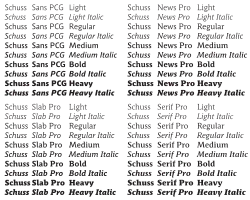 Die vier Stile der Schuss sind im Duktus sehr ähnlich. Auf das Wesentliche reduziert, eignen sie sich für Fließtext und sind somit auch als Verkehrsschrift für größere Distanzen konzipiert. Eine Universalschrift, zurückhaltend im Design. Jede Familie, also jeder Stil, besteht aus fünf Strichstärken, verschiedenen Ziffernarten und Kapitälchen. Der Zeichenausbau der Pro-Schnitte ist Latin extended, während die fünf Schnitte der Sans zusätzlich auch Griechisch und Kyrillisch beinhalten. Die Tabellen-Ziffern und die dazugehörigen mathematischen Zeichen haben über alle Stile und Gewichte hinweg eine identische Breite. Mit derzeit 40 Pro-Fonts (insgesamt 28400 Zeichen) gehört sie zu den großen Schriftsippen.