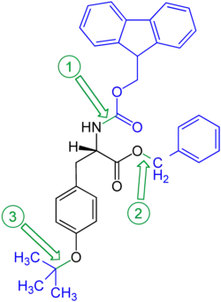 Orthogonal geschütztes L-Tyrosin (Schutzgruppen sind blau markiert, die Aminosäure ist schwarz gezeichnet). (1) Fmoc-geschützte Aminogruppe, (2) als Benzylester geschützte Carboxygruppe und (3) als tert-Butylether geschützte phenolische Hydroxygruppe des Tyrosins.