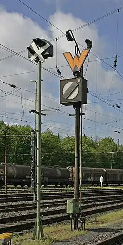 Die Wärterhaltscheibe kann durch ein Formvorsignal Vr 0 (bei der DR Haltvorscheibe Sh 3) angekündigt werden.[1]