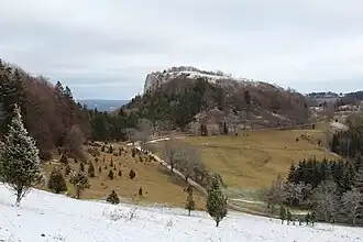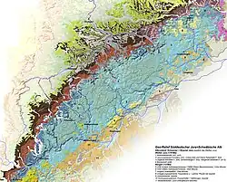 Die Schwäbische Alb, früher auch Schwäbischer Jura oder Schwabenalb genannt, ist ein Mittelgebirge in Süddeutschland und – mit einem kleinen Flächenanteil – in der Schweiz. Die Schwäbische Alb ist etwa 200 bis 220 km lang, 20 bis 40 km breit, inklusive des kleinen Schweizer Anteils 5887,35 km²[1] groß und bis 1015,7 m ü. NHN[2] hoch. Das Gebirge besteht aus mesozoischen Sedimentgesteinen, vor allem Kalkstein, aus der Zeit des Jura und gilt als eines der größten zusammenhängenden Karstgebiete in Deutschland.