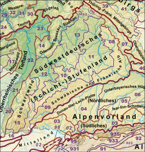 - ↑ a b Emil Meynen, Josef Schmithüsen (Hrsg.): Handbuch der naturräumlichen Gliederung Deutschlands. Bundesanstalt für Landeskunde, Remagen/Bad Godesberg 1953–1962 (9 Lieferungen in 8 Büchern, aktualisierte Karte 1:1.000.000 mit Haupteinheiten 1960).