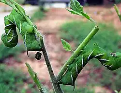 Die Raupen haben entweder einen gleichmäßig zylindrischen, oder vorne stark verjüngten Körper. Er hat eine Kopfkapsel, die aus sechs miteinander verwachsenen, sklerotisierten Platten besteht, sowie 13 Körpersegmenten.[7] Neben den Thorakalbeinen sind alle vier Bauchbeinpaare und der Nachschieber ausgebildet.[4] Die Thorakalbeine enden in scharfen Klauen, die Bauchbeine tragen eine einfache, halbkreisförmige Reihe von Chitinklauen. Der Kopf ist oval, abgerundet oder dreieckig, wobei er im ersten Stadium meistens kugelig ist. Die Stirnplatte (Clypeus) ist dreieckig. An jeder Seite des Kopfes befinden sich sechs Punktaugen (Stemmata) an der Basis der Wangen und der Gula, knapp oberhalb der Fühlerbasen. Die einfachen Punktaugen sind rund und nach außen gewölbt. Die dreigliedrigen Fühler befinden sich an der Basis der Wangen. Alle drei Segmente können teleskopartig eingezogen werden. Die kräftigen, abgestumpften Mandibeln sind ausgekehlt.[7] Ein eindeutiges Bestimmungsmerkmal ist das Analhorn am achten Hinterleibssegment. Bei manchen Arten kann es jedoch im letzten Stadium zurückgebildet sein und ist dann nur als kurzer Tuberkel oder flache knopfförmige Erhebung erkennbar.[4]
