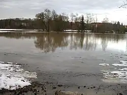 Gelegentlich führt die Schwabach Hochwasser (zuletzt im Februar 2023[8]), in der Regel im Winter nach der Schneeschmelze sowie nach extremen Regenfällen. Der Wasserstand wird an mehreren Messstellen überwacht, in Hetzles,[9] in Büg bei Forth und in Erlangen am Bürgermeistersteg. Bei Hochwasser werden bestimmte Wege in Ufernähe gesperrt. Größere Schäden sind aufgrund der weitgehend naturbelassenen oder zumindest unverbauten Überschwemmungsflächen selten. Dazu trägt auch bei, dass die Schwabach 2001 an einigen Stellen im Stadtgebiet von Erlangen renaturiert wurde.[10]
