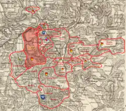 Im südlichen Teil des Quembacher Gerichtes baute sich die Familie einen neuen Stammsitz, das Hofgut Schwabach, oder Schwobacher Hof,[1] und nannte sich danach. Anfang des 14. Jh. verkauften die Herren von Schwabach das Quembacher Gericht an die Grafen von Solms. Wenige Jahre nach dem Kauf verpfändeten die Grafen von Solms die Dörfer des Quembacher Gerichtes an die Herren von Schwabach. Diese schlossen kurz daraufhin eine Ganerbschaft mit den Herren von Schwalbach, setzten einen Amtmann auf und bauten vor den Augen der Dynasten und Grafen eine eigene territorialgeschlossene Herrschaft auf.