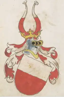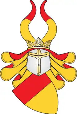 Das Stammwappen besteht aus einem von Rot und Gold geteilten Schild. Die Teilungslinie war im 13. und 14. Jahrhunderten oft so hochgezogen, dass man das Wappen als goldener Schild mit rotem Schildhaupt blasoniert. Auf dem Helm befinden sich mit rot-goldener Decke eine Adelskrone und zwei von Rot und Gold geteilte Büffelhörner.