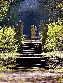 Hinter dem Mausoleum der Schlossherren vom Schwanberg beginnt ein 32 Hektar großes Mischwaldgebiet, das seit Mai 2007 als Bestattungswald genutzt wird.