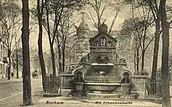 1900 wurde ein Brunnen angelegt. Der Bochumer Steinmetzmeister Josef Schmidt[4] schuf ihn aus Granit und rotem Marmor. Er war mit Tierskulpturen versehen (Schnecke, Wasserratte und zwei Delphine). Aus einem Löwenkopf entsprang Wasser. Im Volksmund wurde der Brunnen „Löwenbrunnen“ genannt. Ältere Karten zeigen ihn von der Vorderansicht mit der Rheinischen Straße in Richtung des Bahnhofs der Rheinischen Eisenbahn-Gesellschaft. Um 1914/15 wurde er auf die Seite mit dem Bahndamm versetzt. In den 1950er Jahren wurde er beseitigt.[5]