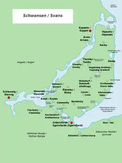 Die Sprachenvielfalt bildet sich auch in den Orts- und Flurnamen Schwansens ab. So sind viele Ortsnamen dänischer Herkunft (v. a. -by für -dorf), jüngere Namen (insbesondere die der großen Gutshöfe) sind dagegen oft nieder- und hochdeutscher Herkunft. Viele dänische Namen wurden später eingedeutscht. Da der deutsche Einfluss sich hier früher geltend machte als im mittleren Schleswig und Angeln, fand der im jüngeren Dänisch vollzogene Wechsel von -torp zu -trup oder -rup durch Wechsel des r hier oft nicht mehr statt. Neben den dänischen und deutschen Formen werden in einzelnen Fällen auch noch ältere gemeingermanische Ortsnamen wie bei Bohnert oder Loose vermutet[10], die evtl. auf die Angeln zurückgehen.