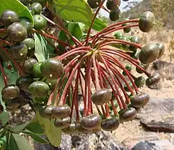Die Früchte sind annähernd kugelige, bespitzte Kapseln. Im reifen Zustand sind sie oft rot oder orange gefärbt oder auch nur rot überlaufen. Da die Samen in eine aus der Plazenta hervorgehende, oft rötlich gefärbte Pulpa eingebettet sind,[1] werden die Früchte manchmal auch als Beeren bezeichnet.[2] Sie haben aber eine ledrige Fruchtwand, die sich bei der Reife unregelmäßig öffnet. In jedem Fruchtfach sind meist zahlreiche Samen vorhanden. Die schwärzlichen, glänzenden Samen haben eine netzartige Oberfläche und sind nieren-, sichel- oder halbmondförmig, elliptisch oder länglich.