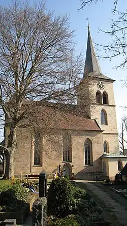 Die Pfarrkirche liegt inmitten des Friedhofes, wobei die Turmfront von den Häusern am südwestlichen Teil des Ortes eng umstellt ist. Der heutige Bau wurde von 1610 bis 1612 an Stelle einer mittelalterlichen Vorgängerkirche errichtet. Eine Inschrift am südlichen Treppenturm weist auf die Erbauung der Kirche im Jahre 1612 durch Georg von Künßberg hin. Der neugotische Turm erhebt sich über einem rechteckigen Langhaus.