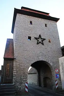 Der Turm hat nur wenige Fenster mit schlichten Rechteckrahmen und ein mächtiges Walmdach; spätmittelalterliche Schießscharten und Pechnasen befinden sich an der dorfabgewandten Seite. Ein Treppenaufgang mit hölzernem Aufbau führt rechts in den Turm. Ein separater Halbrundturm an der Seite endet auf Höhe der Durchfahrt.
