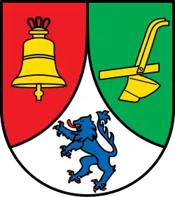 Blasonierung: „Gespalten durch eine eingeschweifte silberne Spitze, belegt mit einem blauen, rotbewehrt und -gezungten Löwen, rechts in Rot eine goldene Glocke, links in Grün ein goldener Pflug.“[6] |