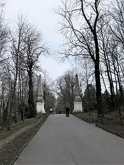 Im Park befinden sich zwei Obelisken, auf deren südlichem der Name KYSELAK eingraviert ist. Joseph Kyselak machte im Biedermeier in seiner Freizeit zahlreiche ausgedehnte Wanderungen durch den Wienerwald. Mit einem Topf schwarzer Ölfarbe ausgerüstet, hinterließ er auf vielen Ruinen, Felsplatten und Brückenpfeilern ganz Österreichs seine berühmten Buchstaben „KYSELAK“. Noch heute ist der Name „Kyselak“ auf diversen Wänden und Plätzen anzutreffen, wenngleich oft in verstümmelter Form, z. B. als „Kisselak“. Die meisten der bekannten Kyselak-Namenszüge sind moderne Fälschungen.