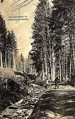 | 29,3 | Hefenkriegbach-Schleuse (stavidlo na Rasovce): Von der Steinzunge der Schleuse zweigte die 1887 errichtete Hefenkriegsbach-Riese (auch Salnauer Riese, Želnavský smyk oder Novopecký smyk genannt) zum Salnauer Schwemmplatz zwischen Nová Pec und Želnava ab. Für diese Stelle bürgerten sich später die Bezeichnungen Jiráček (nach dem Namen des Hegers V. Jiráček) und Pod Smrčinou („unter dem Hochficht“) ein.[15] | |