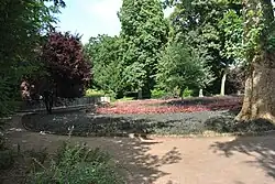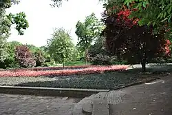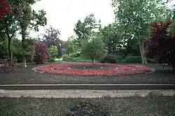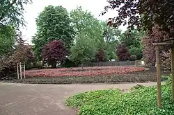 Die Beete sind mit rotem Wesersandstein eingefasst, die Weg mit rotem Ziegelsplitt bestreut.