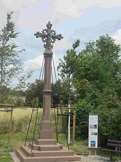 "Die vier, zwischen den Hauptstamm und dem Querbalken entstehenden Dreiecke sind durch zierliches Maßwerk ausgefüllt.... Der Hauptstamm und der Querbalken sind an ihren Enden mit Kreuzblumen gekrönt, deren Blattwerk schräg auf dem vertikalen Achsenschnitt des Kreuzes stehen,.. Zu beiden Seiten links und rechts stehen Figuren der hl. Jungfrau und des hl. Johannes auf kleinen, mit Laub-Ornamenten verzierten Consölchen, die an dem oberen Stück des Schaftes mittels metallener Dollen befestigt sind… ein kreisrunder Lilienkranz von Schmiedeeisen läuft und das Stützwerk herum (vorher sind vier Eisenstützstangen beschrieben) und eignet sich bei besonderen Gelegenheiten zur Aufnahme von brennenden Lichtern. Vor den Fuß des oberen Schaftstückes und zu beiden Seiten legen sich drei steinerne Wappenschilde, deren Eines noch die heraldischen Zeichen der Grafen von Binsfeld erkennen läßt"[2].