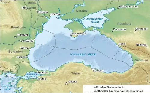 | Städte am Ufer | Burgas, Warna, Mangalia, Constanța, Sulina, Odessa, Mykolajiw, Sewastopol, Jalta, Feodossia, Noworossijsk, Sotschi, Sochumi, Batumi, Rize, Altınordu, Trabzon, Samsun, Zonguldak, Bartın, Sinop, Giresun, Inebolu |