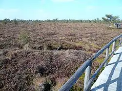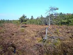 Die zentrale Hochfläche wurde noch bis etwa 1924 als nahezu baumfrei beschrieben. Danach breitete sich die Kiefer aus, vermutlich begünstigt durch die Entwässerungsarbeiten des Reichsarbeitsdienstes zur Zeit des Dritten Reiches.[11] Das Gebiet wurde am 6. Januar 1939 unter Naturschutz gestellt. Danach durfte kein Torf mehr abgebaut werden. In den 1960er- und Anfang der 1970er-Jahre wurde das noch nicht erschlossene Moor zunehmend von Ausflüglern begangen. Dabei bildeten sich im Moor mehrere Trampelpfade. Dies führte vorwiegend an Wochenenden und zu den Ferienzeiten zu einer systematischen Zerstörung großer Teile des Moores. Dabei wurden die Uferbereiche einiger Mooraugen zertrampelt, die dort vorhandene Pflanzendecke teilweise zerstört und Tiere verscheucht. Manche Besucher badeten in den Mooraugen und es befand sich dort ein Sprungbrett.