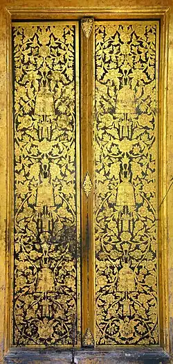 Unter den angewandten Künsten, die von den Thai seit langem betrieben werden, ist die Verzierung mit Blattgold-Zeichnungen auf schwarzem, selten auch auf rotem Lack bedeutsam, um verschiedene Objekte für den religiösen oder täglichen Gebrauch wie kleine Kästchen, Schränke, Türen oder hölzerne Paravents zu verzieren.