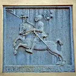 Berent Geistmann schuf 1604 die Lünettenschnitzereien. Die farbige Eingangstür selbst entstand in den 1640er Jahren. Die Schnitzereien oberhalb der Tür zeigen den Kopf des Mauritius.
