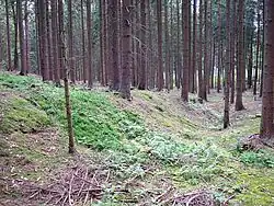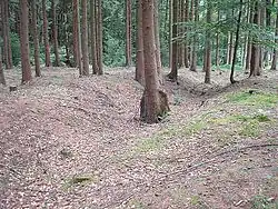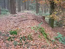 Im Südosten des Kernwerkes laufen zwei kurze Grabentraversen den Hang hinunter zur Talsohle. Die dahinter aufgeschütteten Wallzüge sind nur maximal 1,5 Meter hoch. Der südliche Wallgraben setzt sich auf der Hochfläche als Frontwall fort. Der zugehörige Graben ist hier stellenweise noch etwa zwei Meter tief. Ungefähr zwei Meter unter dem Plateau läuft ein verschütteter Hanggraben oder eine Berme um die Nord- und Westseiten des Hauptwerkes. Kurz vor der südwestlichen Hangkante geht diese Geländestufe in die natürliche Böschung über. Im Süden sind keine eindeutigen Erdwerke feststellbar Der Hang scheint hier weitgehend unberührt zu sein.