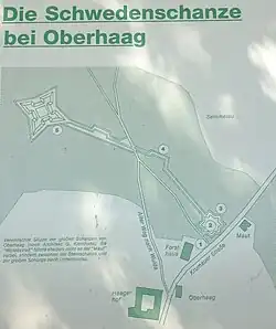 - ↑ Hinweistafel bei der Schwedenschanze, ohne Quellangabe (deskline.net (Seite nicht mehr abrufbar, festgestellt im Mai 2024. Suche in Webarchiven) Info: Der Link wurde automatisch als defekt markiert. Bitte prüfe den Link gemäß Anleitung und entferne dann diesen Hinweis.).