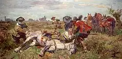 „Freytags früh / machte sich Ihr Königl.Mayst. sampt dritt / zu einer Schanze / derselben Beschaffenheit ein Augenschein abzunemen / in Hoffnung / Er Feind würde bey abgenommener Schanz sich gnug zu wehren haben / Im zurückwenden aber solcher Recognoscation wurd ein Stück gelöst / Welches Ihr Maystat das Roß unterm Leib hinweg nimmt: Ihr Mayst. aber Daßfferem Gemüth und unerschrockenem Herzen nach / kam wieder zu frischem Roß / unnd Ordnete zum schleunigen Fortgang / die vorgenommene Werk weiter an.“