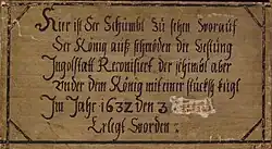 „Hier ist der Schümbl zu sehen worauf der König auß schwöden die Festung Ingolstatt Reconisiert der schimbl aber under dem König mit einer stucksh kugl Im Jahr 1632 den 3 (Monat weggekratzt) Erlegt worden.“