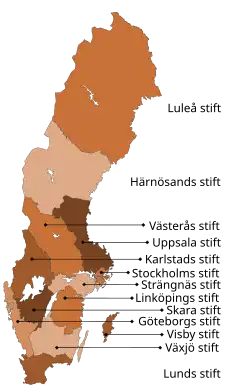 Die Verwaltungsgliederung der Schwedischen Kirche mit einer Erzdiözese (ärkestift) in Uppsala und 13 Diözesen (stift), die jeweils von einem Bischof (biskop) geführt werden, geht noch auf die vorreformatorische Zeit zurück. Der Erzbischof von Uppsala ist damit auch der höchste Repräsentant der Schwedischen Kirche. Den Diözesen untergeordnet sind die sogenannten Kontrakte (kontrakt), von denen es insgesamt 174 gibt. Sie werden von einem Propst (kontraktsprost) geführt und unterteilen sich in jeweils mehrere Pastorate (pastorat). Diese wiederum bestehen je aus einer oder mehreren Kirchengemeinden (församlingar).