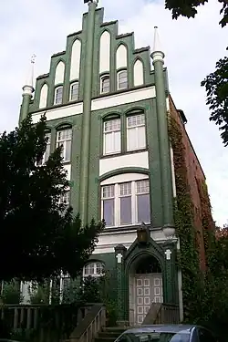 Das Gebäude, dessen Front mit der Jugendstil-Aufschrift Svenska Kyrkan oberhalb des zweiten Obergeschosses versehen wurde, hat keinen Glockenturm. Der Treppengiebel wurde auf den unteren Stufen rechts und links mit je einem Türmchen versehen, die jeweils einen stilisierten Anker trugen. Von ihnen ist nur der linke erhalten. Auf der höchsten Stufe des Giebels befindet sich noch das Kreuz mit Strahlenkranz. Die Straßenseite des Backsteingebäudes mit Stilelementen der Gotik und Renaissance ist mit grün glasierten Ziegeln versehen.