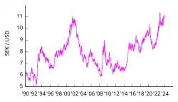 Seit 1953 verlor die schwedische Krone gegenüber der Deutschen Mark (DM) stetig an Wert.[31] 1999 wurde die Deutsche Mark vom Euro in Deutschland abgelöst. Die folgende Grafik und Tabelle zeigen die historischen Wechselkurse: